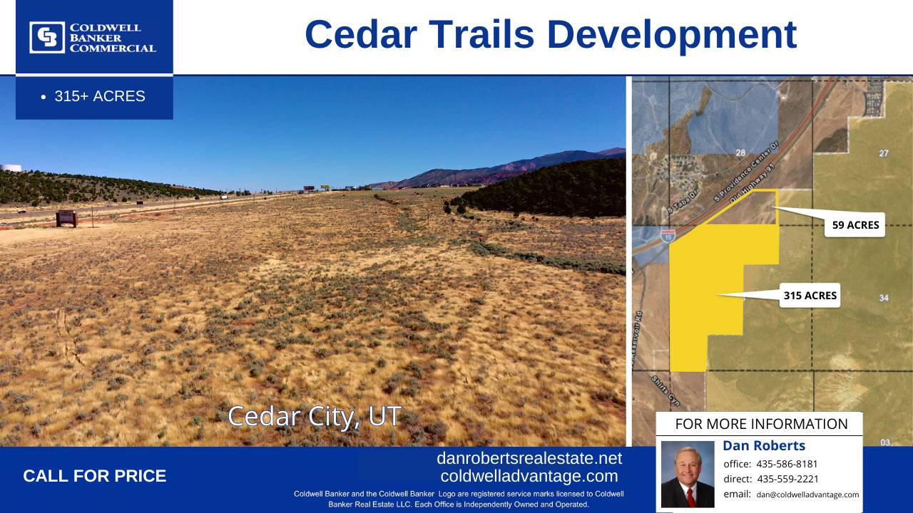 315 acres east of I-15. 96 acres zoned Commercial, 224 acres zoned Residential. Master Planned area. Visible from I-15, close to hotels, restaurants, residential, and walking trails. Currently in Greenbelt. Sewer nearby.